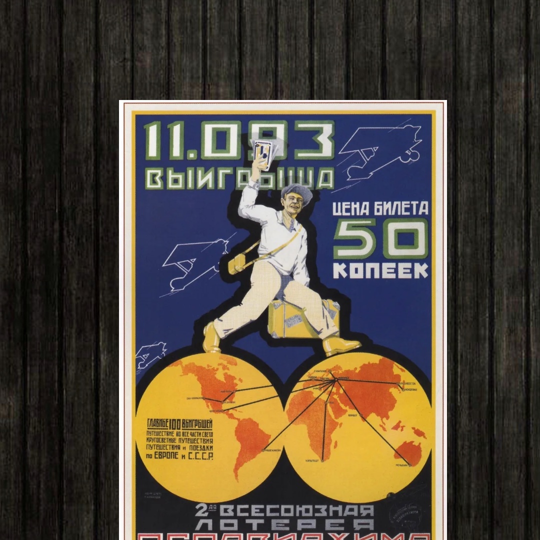 O Osoaviakhim foi a maior organização soviética de defesa civil e aeronáutica das décadas de 1920 e 1930 — uma sociedade voluntária de massa que preparava cidadãos para a aviação, a química e a defesa do território. Com milhões de filiados, era peça central na construção do homem novo soviético, combinando educação técnica popular e propaganda patriótica. Suas loterias eram campanhas de financiamento público que misturavam gamificação com mobilização coletiva, transformando sorteios em atos políticos. Os cartazes da época — com aviões, paraquedistas e operários de olhos no futuro — são hoje ícones do construtivismo soviético, onde arte e ideologia marchavam juntas. Nesse adesivo, a referência vira recado portátil. Adesivo de vinil resistente. Cole onde quiser.