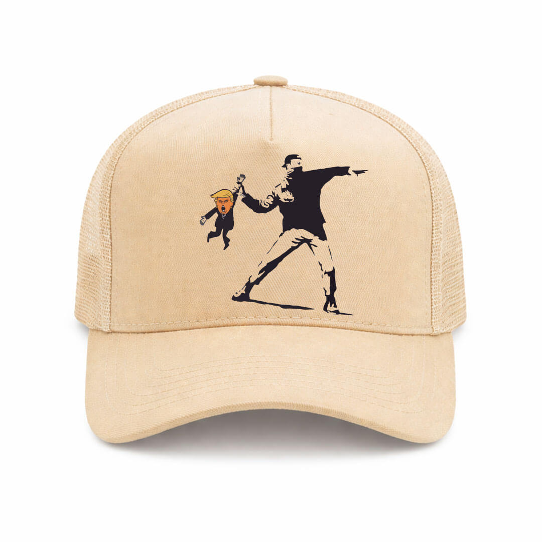 O Boné Trucker “Voa Trump” pega a estética de protesto urbano (stencil, alto contraste) e coloca onde dói mais em certas pessoas: bem na sua cabeça, no meio da rua. A arte “Voa Trump” é sátira política direta, usando caricatura e ironia para transmitir crítica sem floreio.