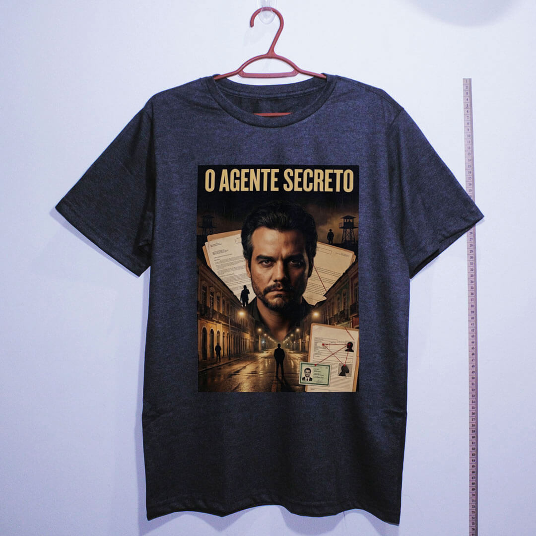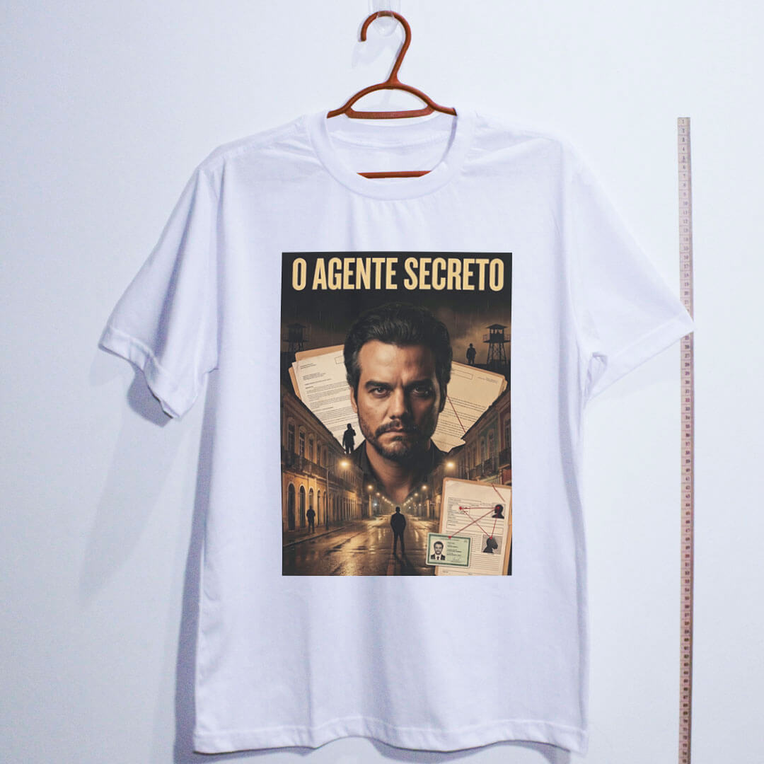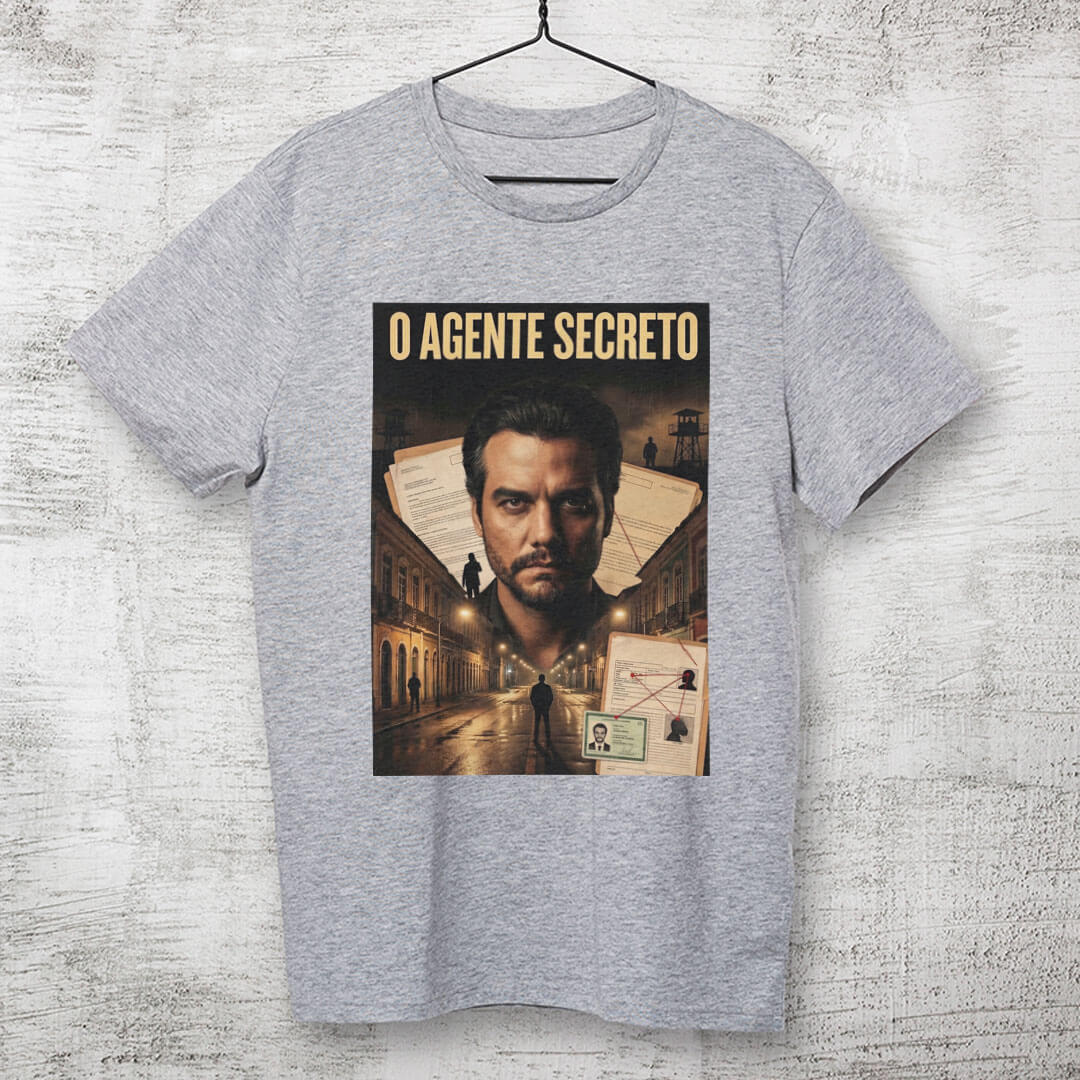 Camiseta de algodão inspirado em O Agente Secreto, filme de Kleber Mendonça Filho com Wagner Moura, feito para quem acompanha o cinema brasileiro contemporâneo e quer transformar essa referência em peça de uso real. A versão estilizada reinterpreta o universo visual do filme com clima noir, ruas molhadas, arquivos, vigilância e a presença central do protagonista. Ela conversa com a ideia de investigação, perseguição e segredo, transformando a atmosfera do longa em uma peça mais dramática e urbana. É a leitura mais gráfica e comercial da coleção, sem perder a referência ao filme.