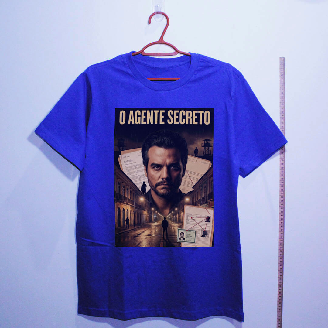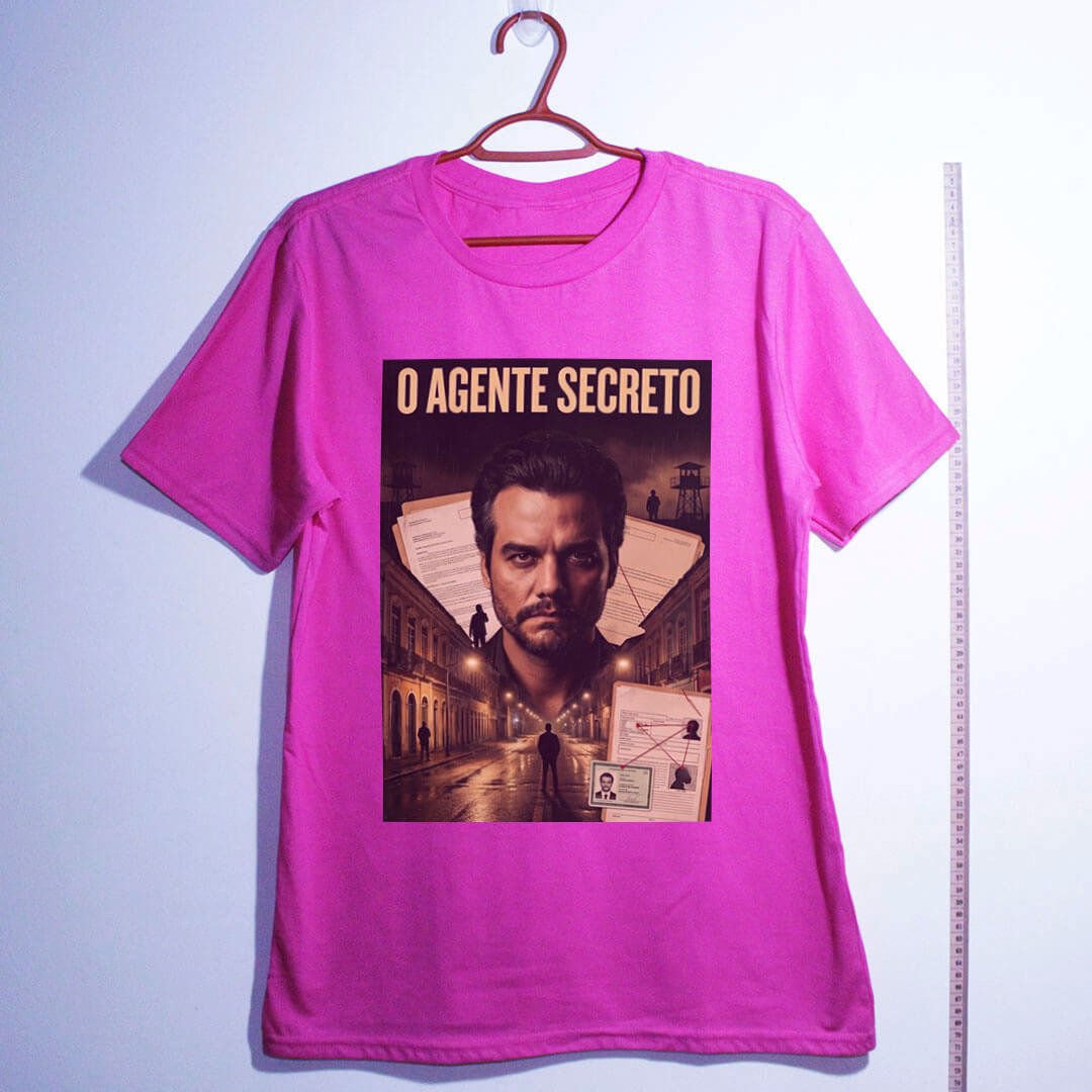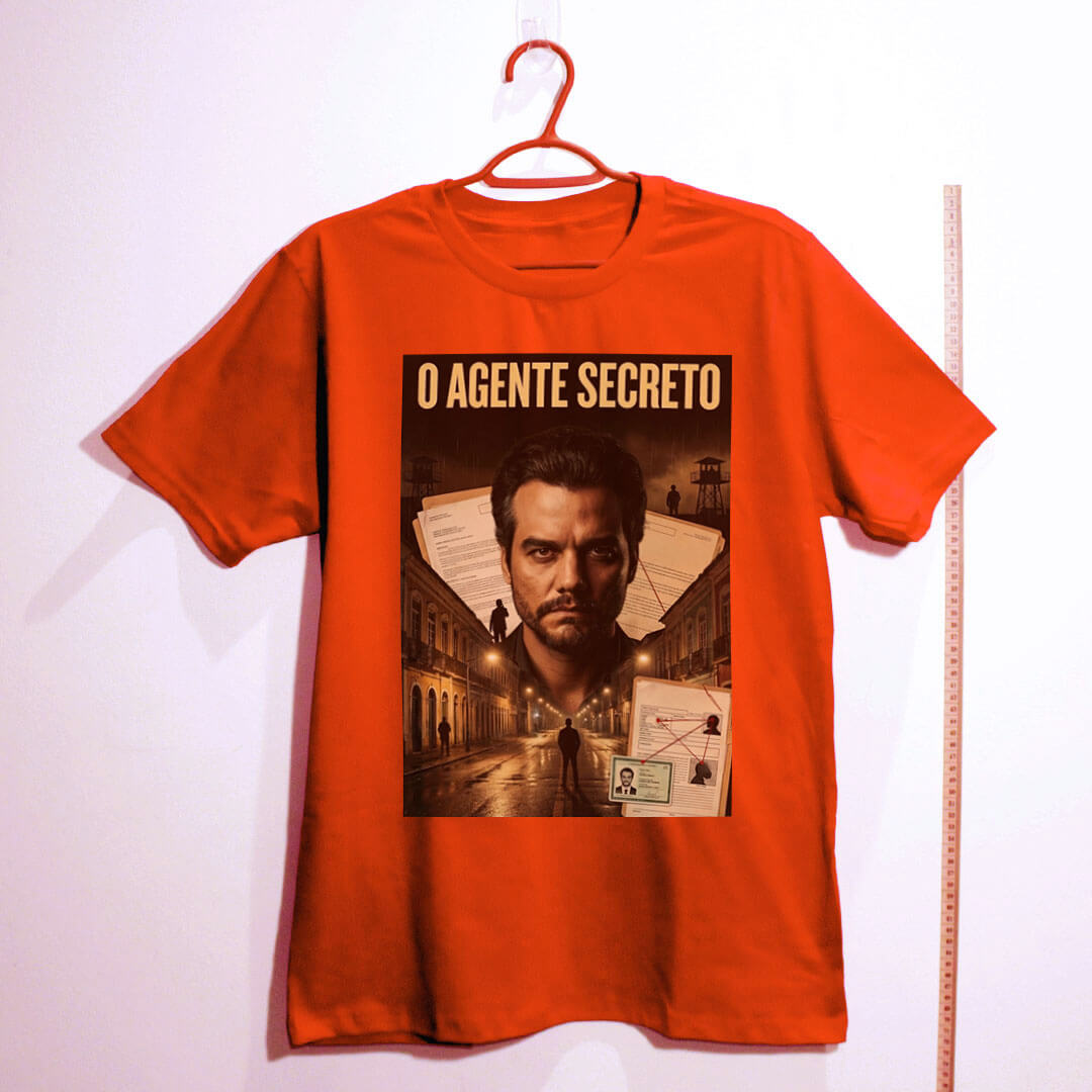Camiseta de algodão inspirado em O Agente Secreto, filme de Kleber Mendonça Filho com Wagner Moura, feito para quem acompanha o cinema brasileiro contemporâneo e quer transformar essa referência em peça de uso real. A versão estilizada reinterpreta o universo visual do filme com clima noir, ruas molhadas, arquivos, vigilância e a presença central do protagonista. Ela conversa com a ideia de investigação, perseguição e segredo, transformando a atmosfera do longa em uma peça mais dramática e urbana. É a leitura mais gráfica e comercial da coleção, sem perder a referência ao filme.
