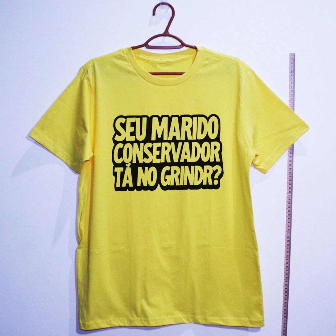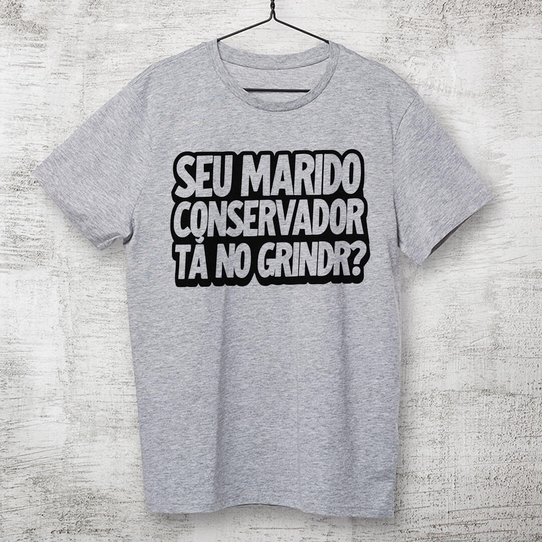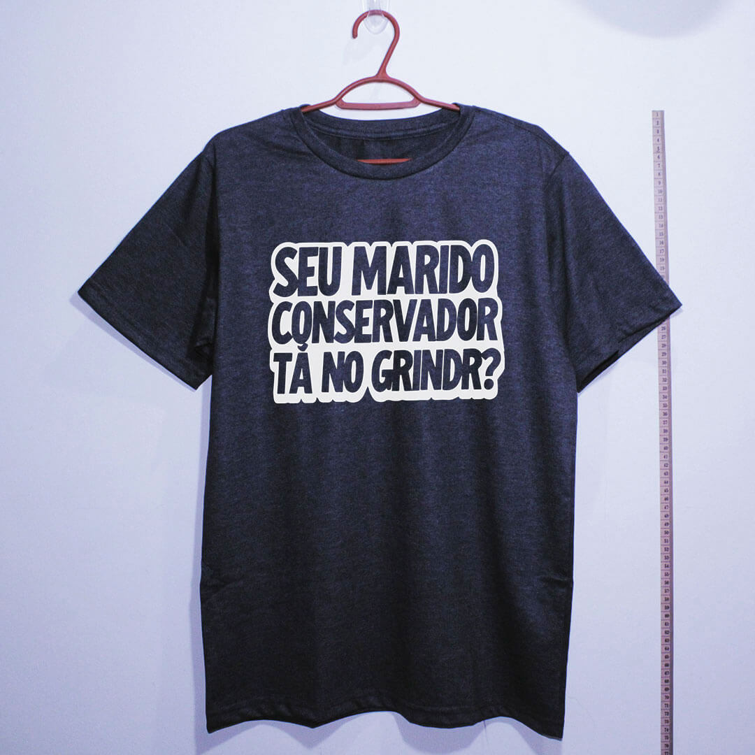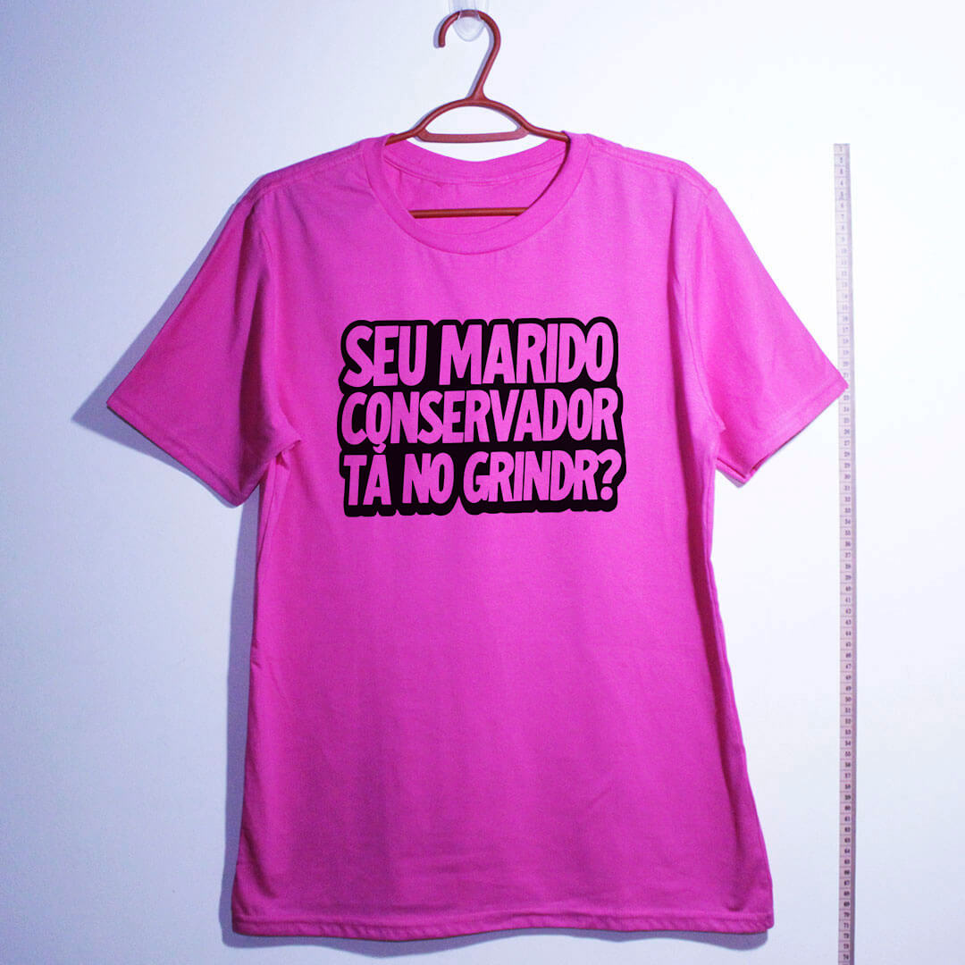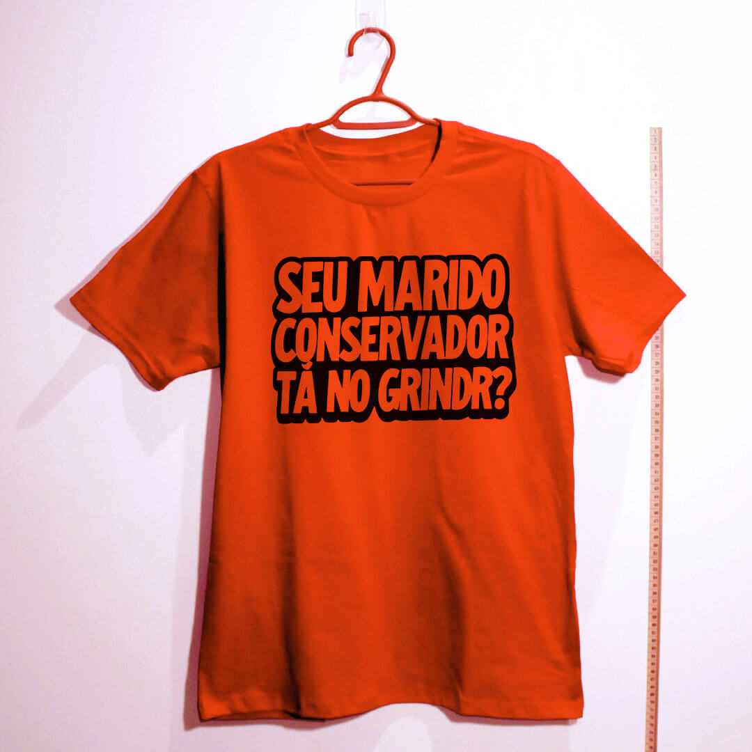 Camiseta de algodão com a frase “Seu marido conservador tá no Grindr?”. É sátira política em formato de pergunta, feita pra expor a hipocrisia do discurso “família e bons costumes” quando a realidade resolve aparecer.