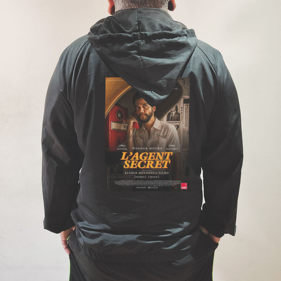 Corta vento inspirado em O Agente Secreto, filme de Kleber Mendonça Filho com Wagner Moura, feito para quem acompanha o cinema brasileiro contemporâneo e quer transformar essa referência em peça de uso real. A arte francesa de L’Agent Secret, conhecida no Brasil como O Agente Secreto, valoriza uma composição mais contida, centrada em Wagner Moura ao telefone, cercado por sombras, paredes marcadas e um orelhão vermelho que funciona quase como um símbolo de urgência, vigia e clandestinidade. É uma imagem perfeita para quem gosta de posters internacionais, cinema político e peças com atmosfera mais sóbria.