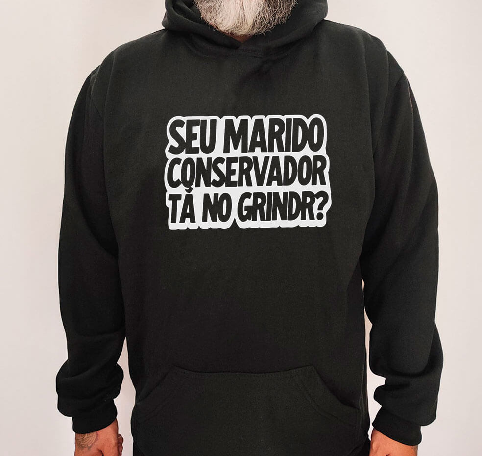 Moletom com capuz com “Seu marido conservador tá no Grindr?” pra entregar provocação com conforto. A frase é uma cutucada direta na hipocrisia: discurso rígido por fora, comportamento nada rígido por dentro.