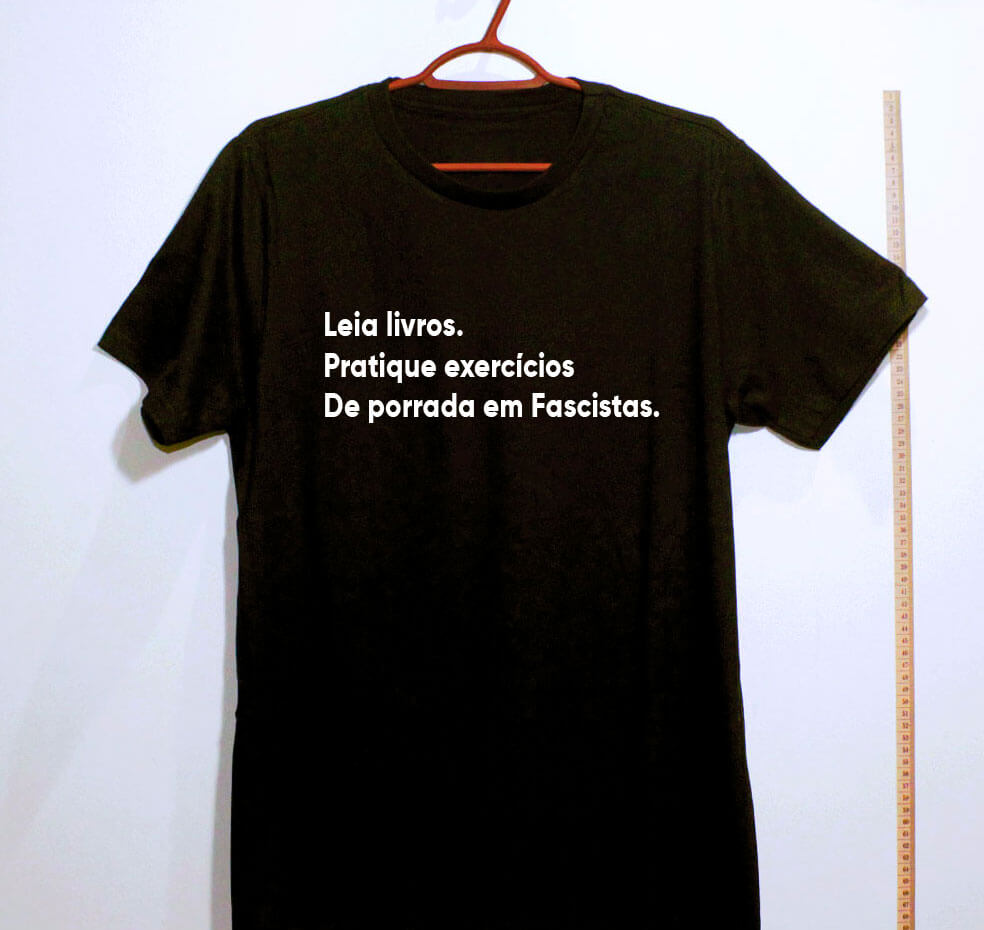 | Estampa e cor | CCCP – Cinza, Ditadura nunca mais – Nova versão – Branco, Ditadura nunca mais! – Escudo – Chumbo, Dom Helder Câmara, quando dou comida aos pobres – Branco, Fantasma comunista – Escudo – Chumbo, Karl Marx – No Class – Vermelho, Leia livros, pratique exercícios, de porrada em fascistas – Preto, Lula Livre – Preto, Viva o Povo Palestino – Branco |